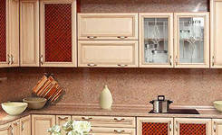 По стилю кухня Турин напоминает нам классические гарнитуры из массива, однако стоимость первой значительно ниже. Мебель производится из рамочного МДФ, а сверху покрывается ПВХ, благодаря чему фасад становится более долговечным и влагостойким, что весьма важно для кухонного помещения. Также МДФ является экологичным материалом.