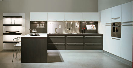 Кухня «Эльба 2»  Нижние модули выполнены из МДФ, шпонированной европейским дубом (цвет венге). Навесные антресоли  и пеналы белого цвета (материал Акрилайн с "глубоким" глянцевым отражением). Стеновая панель пластик со вставкой из алюминия.