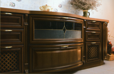 Кухня «Фортуна-1», цена за образец на фото - 160200 руб. Фасад представляет собой рамочку конструкцию из профиля и объемной филенки, с отделкой патиной. Патина - многослойное лакокрасочное покрытие , которое придает поверхности визуальную объёмность и выразительность. По желанию покупателя, центральная часть фасада может быть выполнена из МДФ толщиной 4 мм с одним из предлагаемых вариантов фрезеровки. В наборах с фасадами «Фортуна -1» возможно изготовление вогнутых настенных и напольных изделий. Логичным завершением набора может являться шкаф диагональный с гнутой дверью на 350 мм. А напольные переходные изделия и шк-ст 900, с двумя ящиками (гнутые накладки) подчеркнут индивидуальность набора, добавят лоска и изысканности всей композиции. Обращаем Ваше внимание на возможность идеального подбора цвета патины от набора к набору, в связи с ручным нанесением.