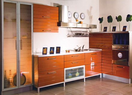 Кухня «Лилия», цена за образец на фото - 143000 руб. Фасады МДФ толщиной 18 мм, покрытые полиуретановой шелковисто-матовой или высокоглянцевой эмалью. Особенностью данного рисунка является фрезерование на фасаде горизонтальных полос на расстоянии 90 мм друг от друга.