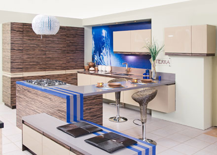 Кухня «Terra» (НОВИНКА) Индивидуальный дизайн и испольвание различных фасадных материалов (эмаль, пленка, массив, шпон) позволяют гармонично совместить зону гостиной и кухни. Столешница — искусственный камень ATRIO, MONTELLI, HI-MACS, STARON, CORIAN. Фурнитура производства Италии (BLUM, GRASS). Возможность комплектации мойками и смесителями BLANCO, TEKA, FRANKE и бытовой техникой ведущих мировых производителей.