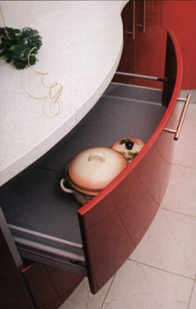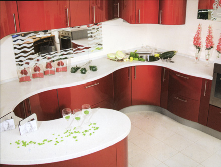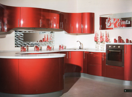 Кухня «Виктория», цена за образец на фото — 345000 руб. Богатая утонченная кухня с разнообразными композиционными и эстетическими возможностями. Для данной модели характерны изогнутые формы, чередование вогнутых и выпуклых поверхностей. Фасады толщиной 18 мм и с характерным скосом покрыты шелковисто-матовой или высокоглянцевой полиуретановой эмалью итальянского производства. Более 2000 вариантов цвета.